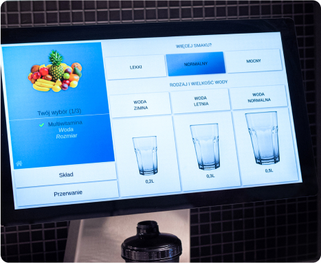 Kiedy klient wybierze swój napój, jego nazwa podświetla się kolorem przypisanym do smaku. Np. izotonik truskawkowy podświetlony jest kolorem czerwonym. Niby nic, a czujesz się, jakbyś zamawiał napój na pokładzie statku kosmicznego Enterprise…